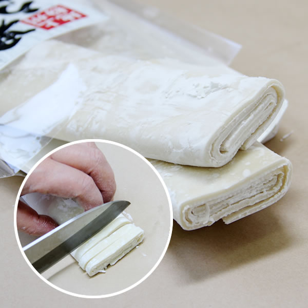 男気うどんは、ご家庭で自由にカットできるシート状。 ですからお好みで自由な太さにお切りいただけます。 2センチ幅、3センチ幅など大胆に太めに切るのが おススメ。