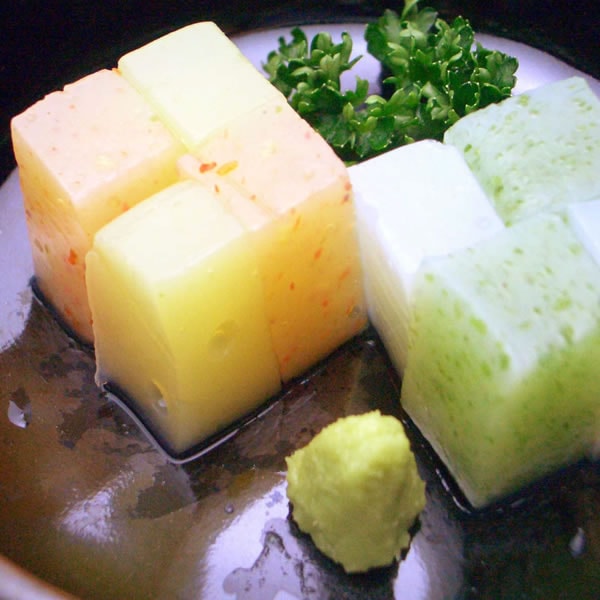 ・生ゆずと明太タイプを薄くスライスし酢醤油で和えました。(写真左) ・4それぞれをサイコロカットしてみました(写真右)